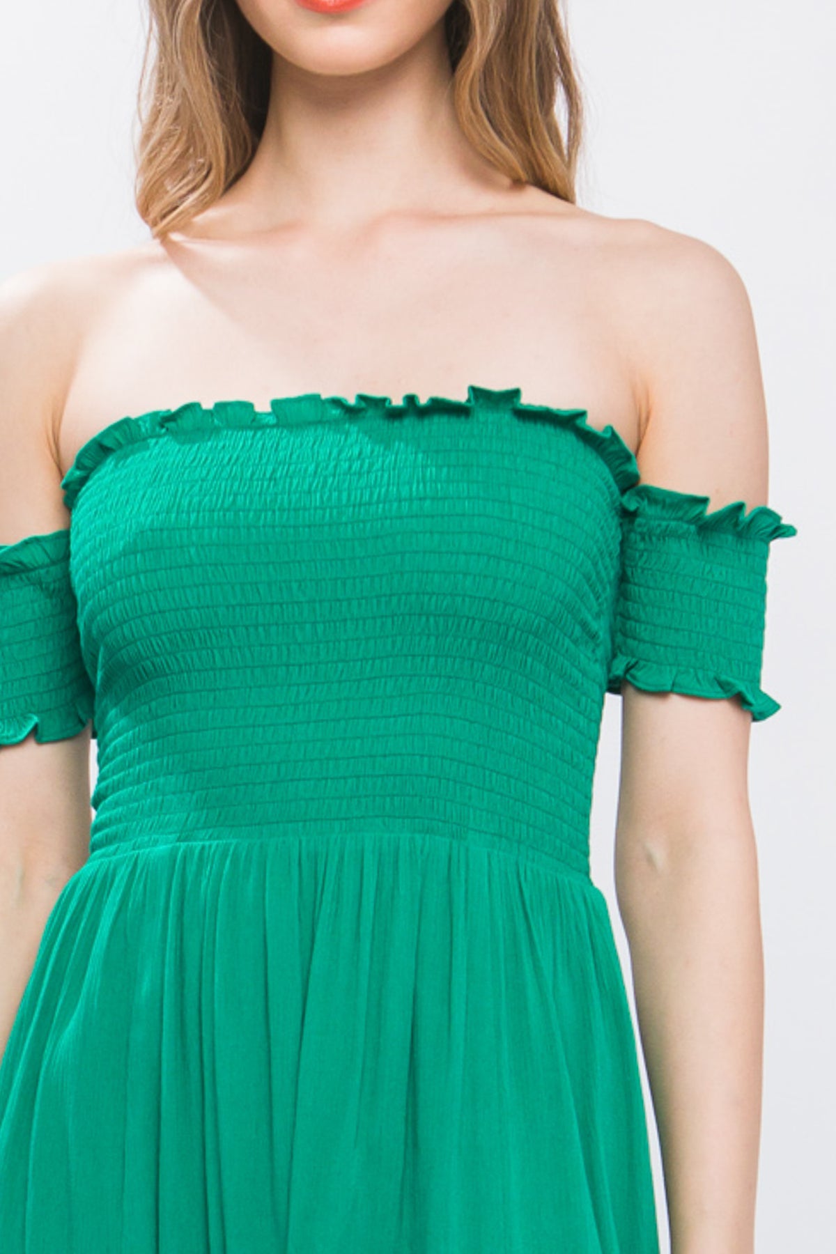 Get ready to radiate charm and grace with our Flowy Off-The-Shoulder Dress in Green. Add it to your cart now and experience the perfect blend of fashion and comfort!