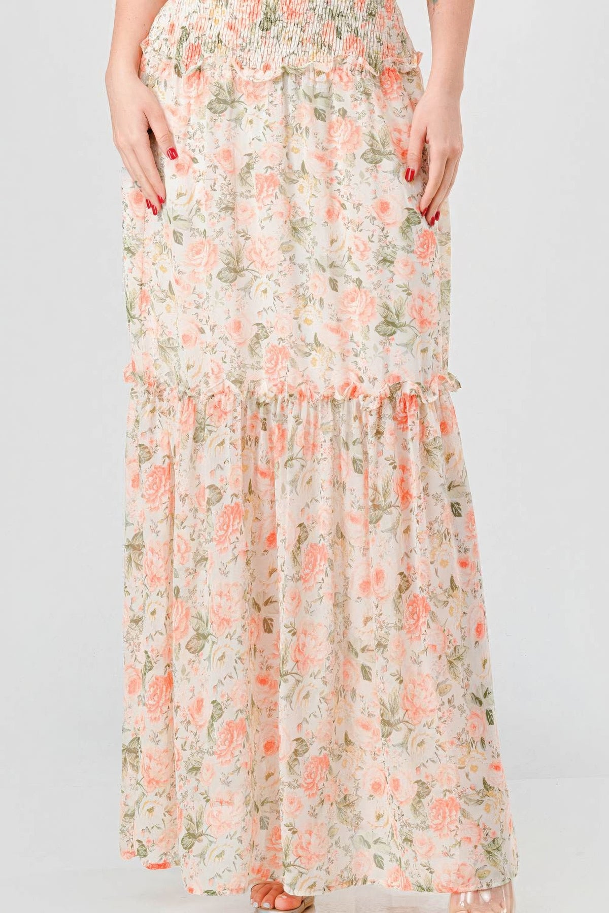 Floral Chiffon Off Shoulder Smocked Back Ruffled Tiered Maxi Dress