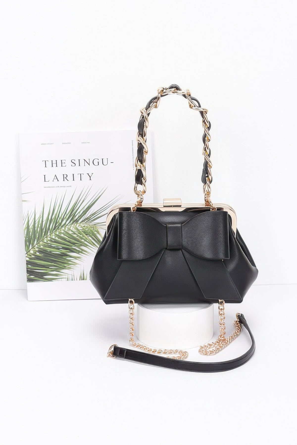 Faux Leather Ribbon Chain Handle Party Clutch - Beige