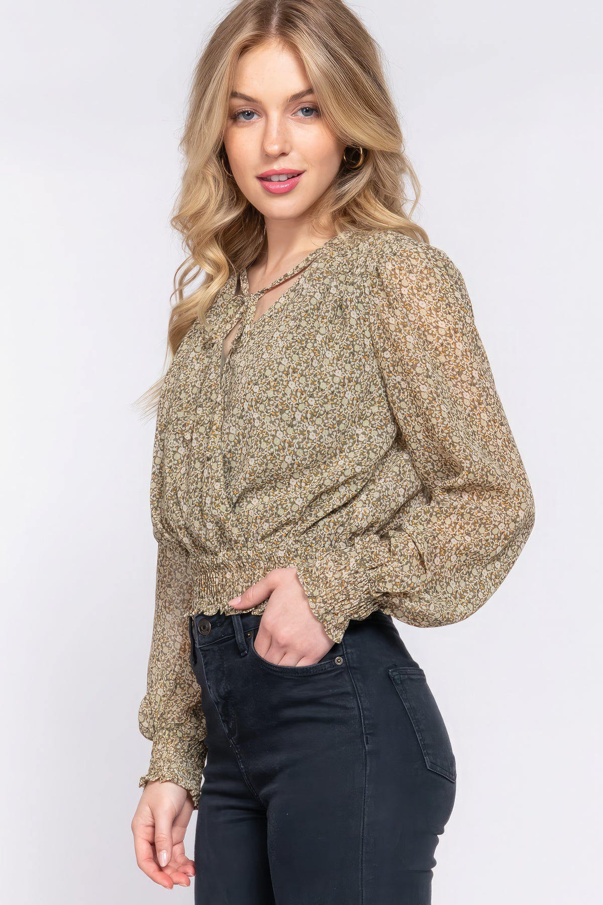 Elevate your style with the Long Sleeve Front Surplice Tie Detail Waist Smocked Floral Printed Chiffon Blouse in Olive. Add this graceful and feminine piece to your collection for a timeless and chic look!