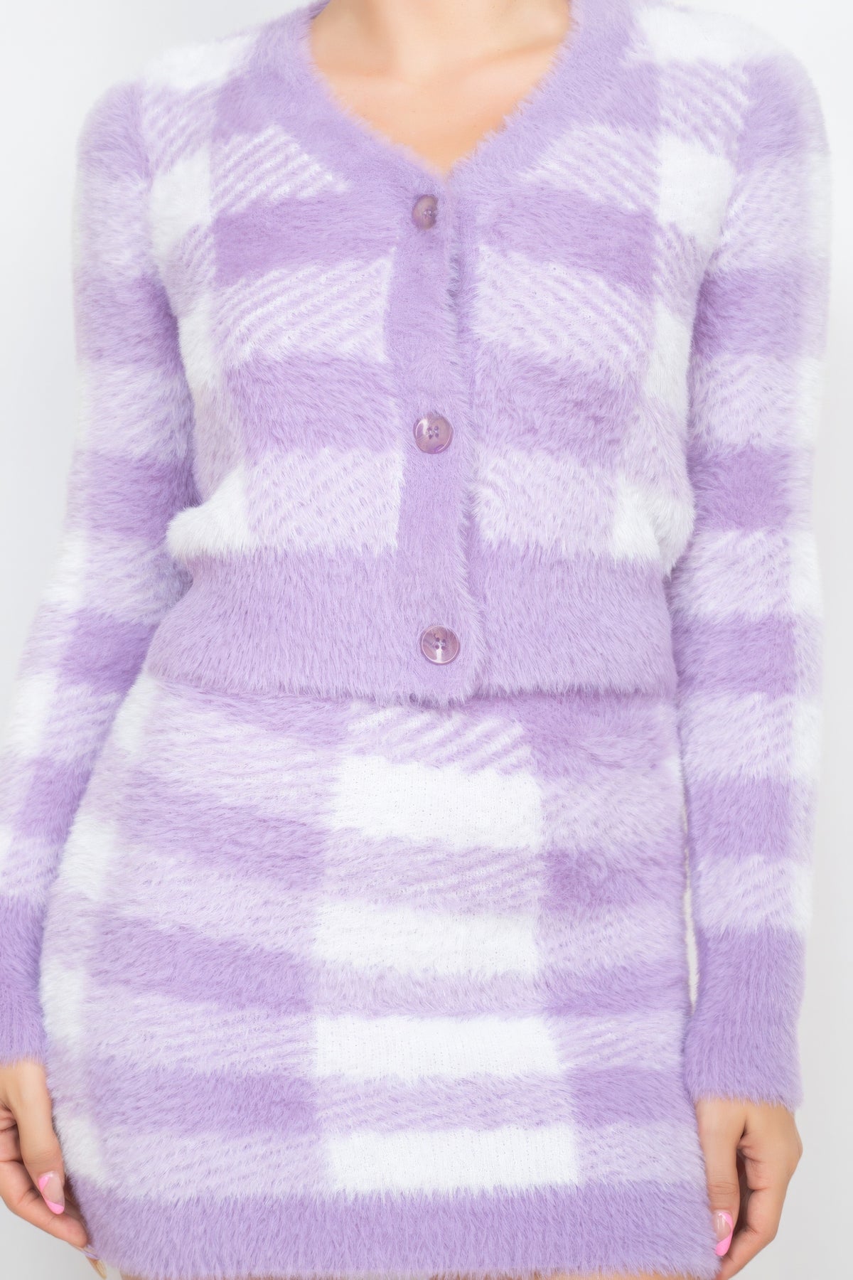 Elevate your winter style with our Plaid Button-front Cropped Sweater Cardigan—an absolute essential for staying cozy and chic. This fuzzy knit cardigan showcases a delightful plaid pattern, accentuated by a button-front closure, long sleeves, a v neckline, and a modern cropped hem. Crafted from 100% Nylon, the Dusty Lavender hue adds a touch of sophistication to this must-have winter piece.